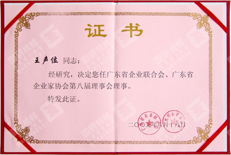公司董事长兼总经理被授予广东省企业联合会、广东省企业家协会第八届理事会理事证书