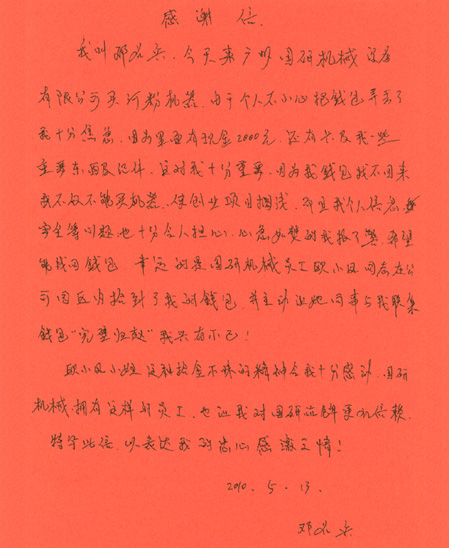 5月13日下午,一封署名为邓名兵的感谢信送至公司领导手中,信中详细描述了公司仓管员欧小凤拾金不昧的感人事迹,请求公司对欧小凤进行表扬,并感谢公司培养了欧小凤这样的好员工。